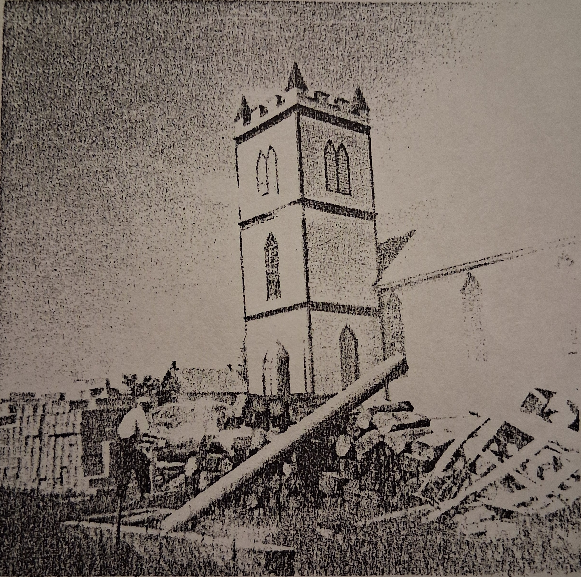 During the summer of 1926 the first bell tower was torn down and replaced with the present one. Those who remember the old bell tower recollect that it commenced at the bottom the same size as at present and gradually tapered to about half the size at the top and had a pointed roof. It had no embellishment of any kind and was really a most uncouth looking affair stuck on the side of a church.